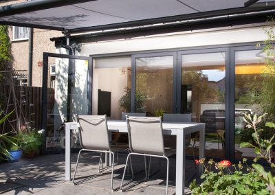 Zoe and Graham had a great home and after completing a attic conversion giving them plenty of bedroom space, they wanted a large ground floor living space for themselves and their two children to further enjoy. We built a ground floor rear extension, creating a kitchen/dinner and lounge area, which worked as a versatile space for their family. The builders installed a large set of bi-folding doors and Velux roof windows, filling the room with light and space. Zoe and Graham’s garden was south facing and in order to keep the back of the house cool in the summer, they opted for an electric remote controlled awning to use on sunny days. In addition to this, they chose electric exterior sun blinds fitted to the Velux, windows, for maximum flexibility. Three years on from the extension Zoe and Graham remain very happy with their build, as expressed in their testimonial.